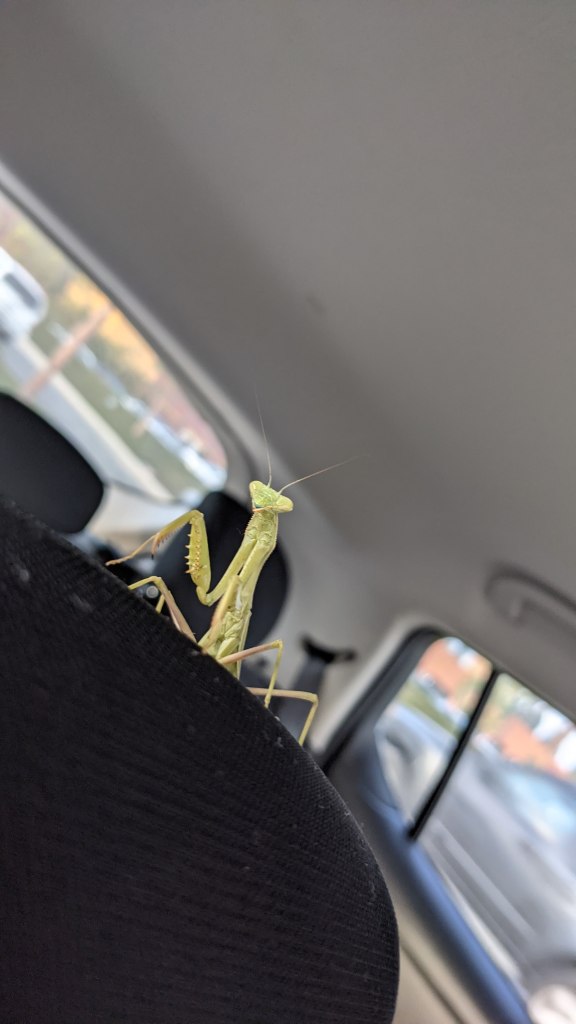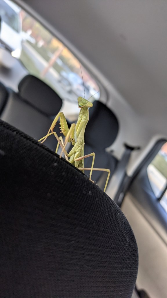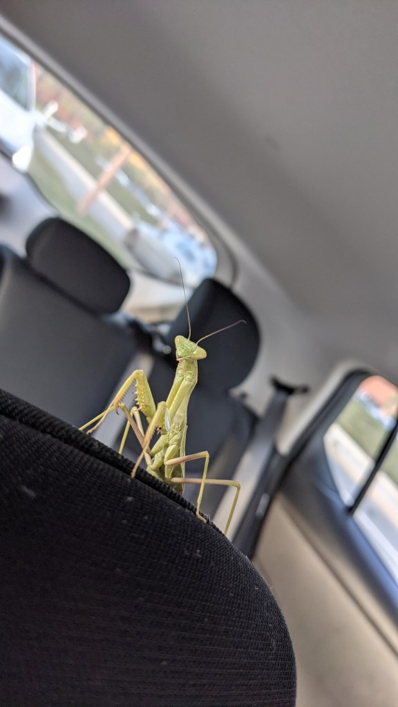 I saw this preying mantis on the ground. It seemed injured. It did not move as I walked past it on the hot asphalt. I didn’t want someone to kill it (accidentally or purposely), so I picked it up. It attached itself to me and clung on while we went grocery shopping. It decided to return to the wild when we got back home. I enjoyed my time shopping with The Mantis.