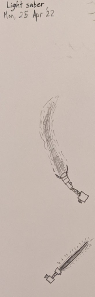 Two drawings… both of sword-like weapons that use light as the fuel for their energy. (Was that enough to avoid copyright infringement?)
