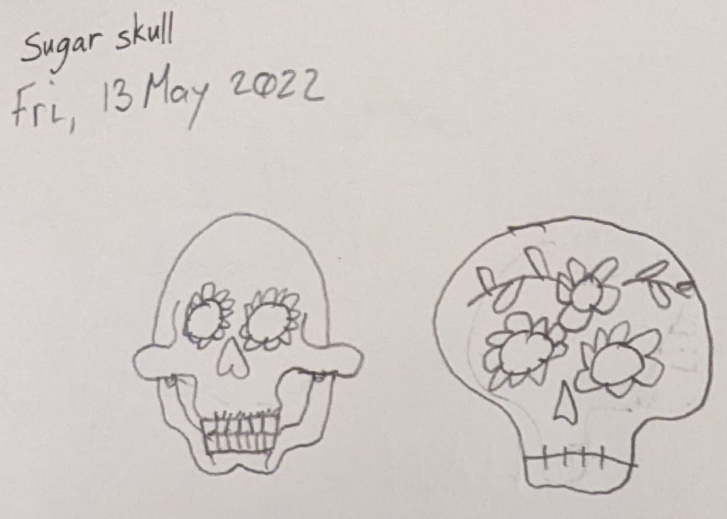 My attempt to draw a sugar skull. My CDO (that’s OCD in THE RIGHT ORDER) was very pleased that this drawing prompt came up on Friday the 13th. I think my sugar skulls are very scary… rawr! OH! Sorry… scared myself.