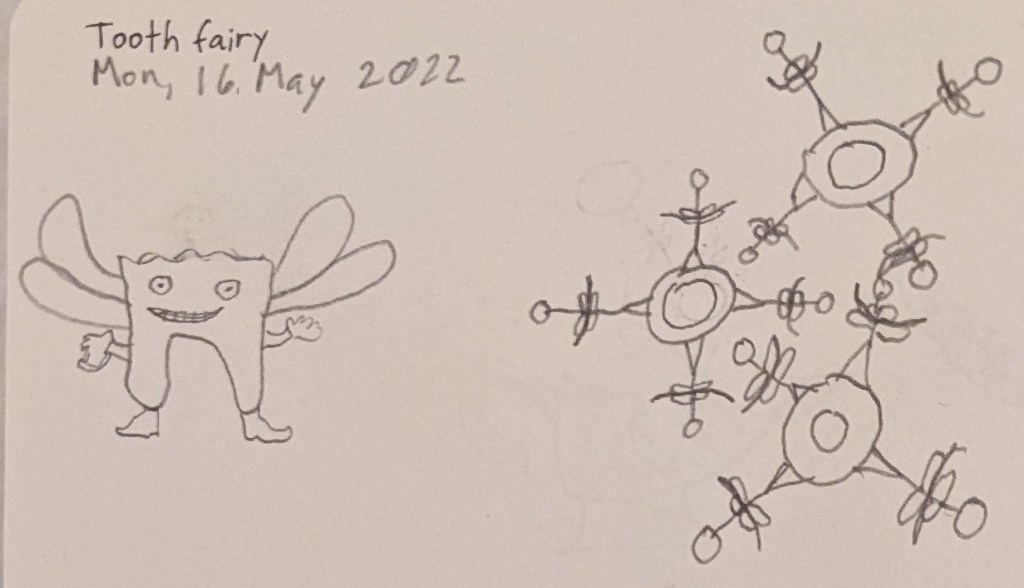 The drawing on the left is a tooth fairy. A tooth that is a fairy. Wish I could say I thought of this, but a Google Image search of “Tooth Fairy” proves I am not the first (or billionth, apparently.)