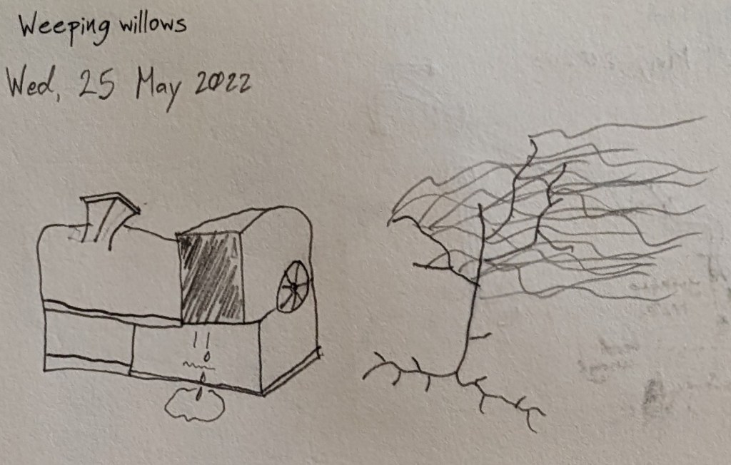 Two drawings…On the left, a willow machine, weepingOn the right, the tree