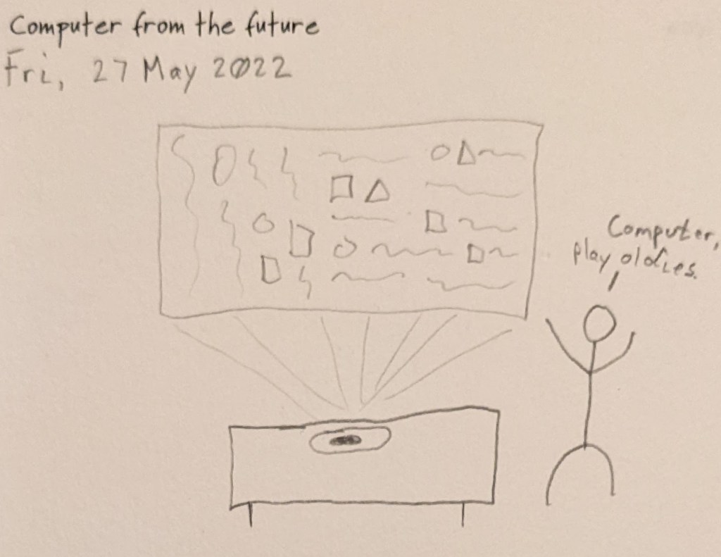 It’s a small disc on a table with a holographic, interactive display that is voice activated. The prompt didn’t say how far into the future…