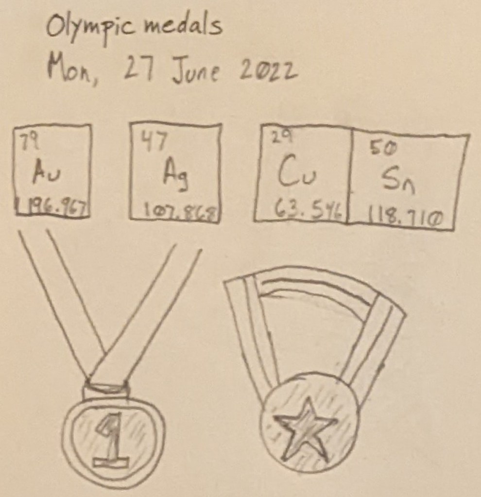 Three sketches of the entries in the PTotE for the metals: Gold, Silver, and Bronze (bronze is a composite metal and not in the PTotE). I don’t know why I’m this way…