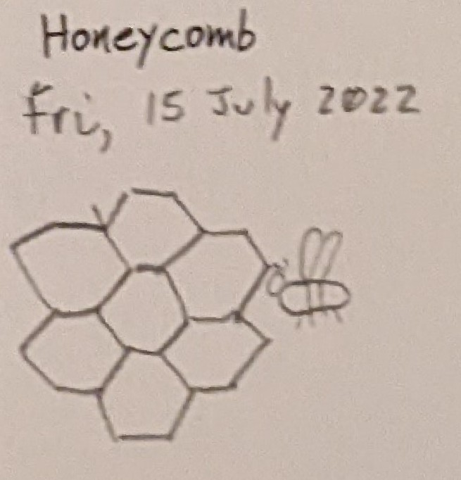 Seven pentagons attached in a symmetrical pattern. To ensure everyone knows that this pattern is representative of honeycomb, I added a bee. The addition of the bee ensures everyone can identify this sketch as honeycomb and NOT seven pentagons in a symmetrical pattern. Yup. I did that. You’re welcome.