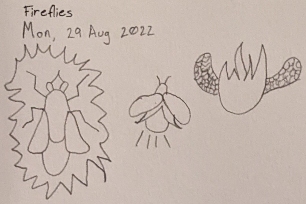 Three sketches: a fly that is on fire, a firefly (lampyridae), and a fire that flies (it has wings.) The sarcasm is immense.