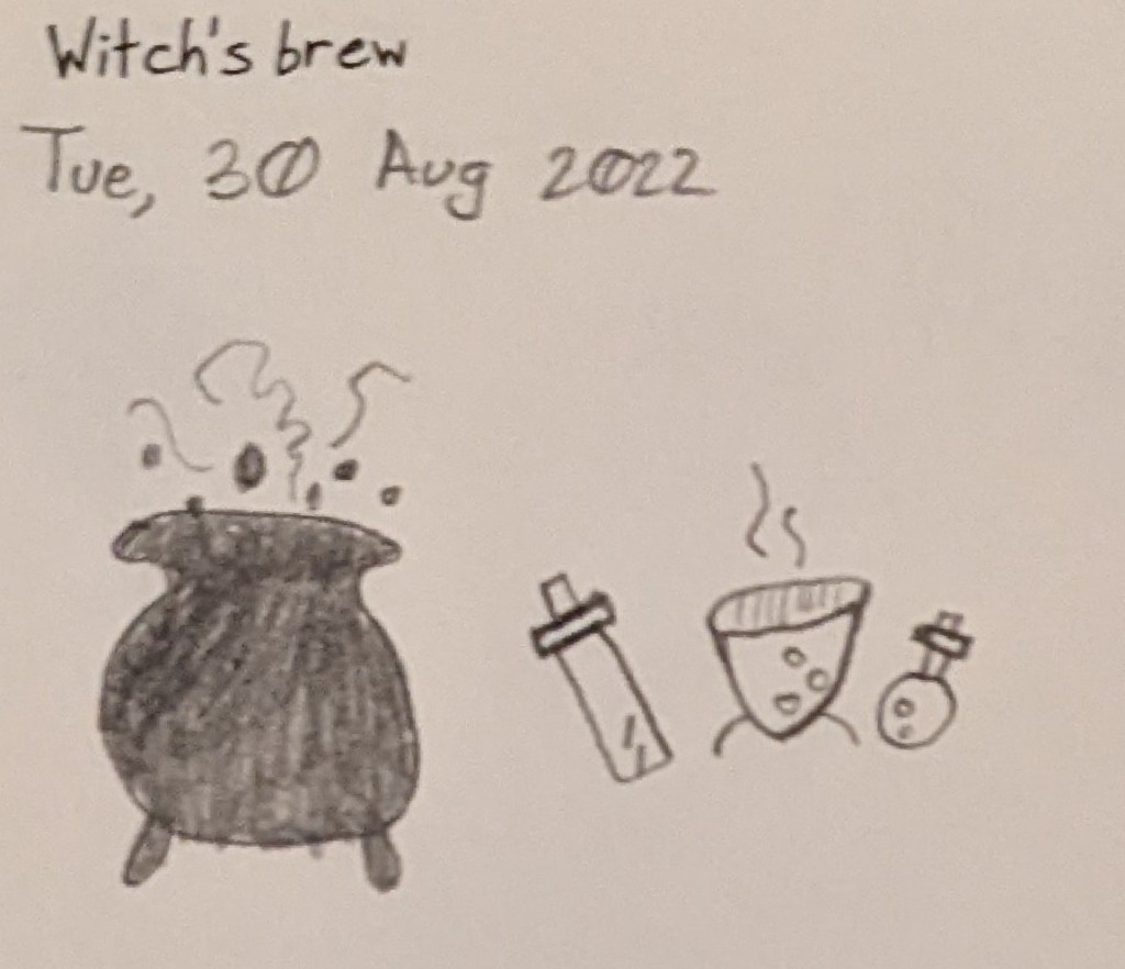 A black caldron, often associated with witches and a smaller, caldron with vials and stoppers.