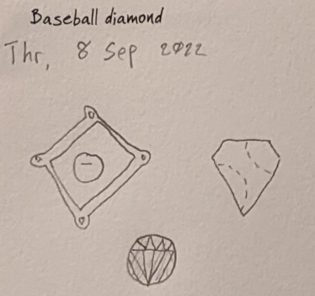Three sketches: a baseball field, a diamond shaped like a baseball, and a baseball shaped like a diamond.