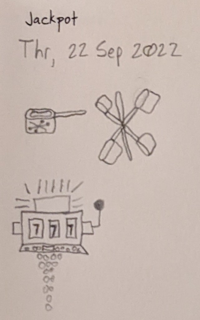 Three jackpots. A pot made for Jacks (jack’s pot), a jack made out of pots (a pot jack), and a gambling machine dumping coins out because of a win (a jackpot.)