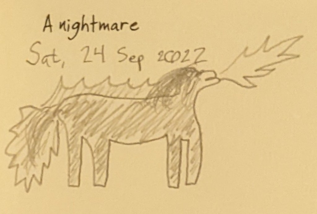 Weird lighting/color for this drawing. Don’t know why. Anywho… it is a night-mare. A scary female horse. It is scary because it breaths fire and has fire for a mane and tail. Ooooooooooo.