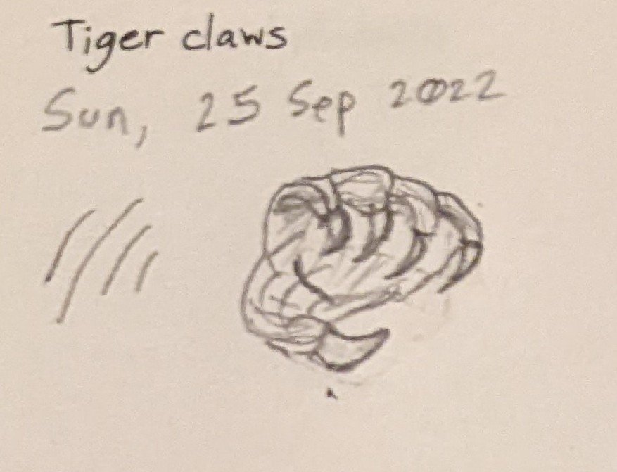 Two drawings. The first is a tiger scratch. After realizing that my 0.1 seconds spent drawing lines could be improved, I decided to go the extra 0.2 seconds (or miles, if you wish) and draw the second sketch. The second is an actual tiger claw. Well… not an *actual* tiger claw. More like a representation of a tiger claw. Yeah… we’ll go with that… a “representation.”