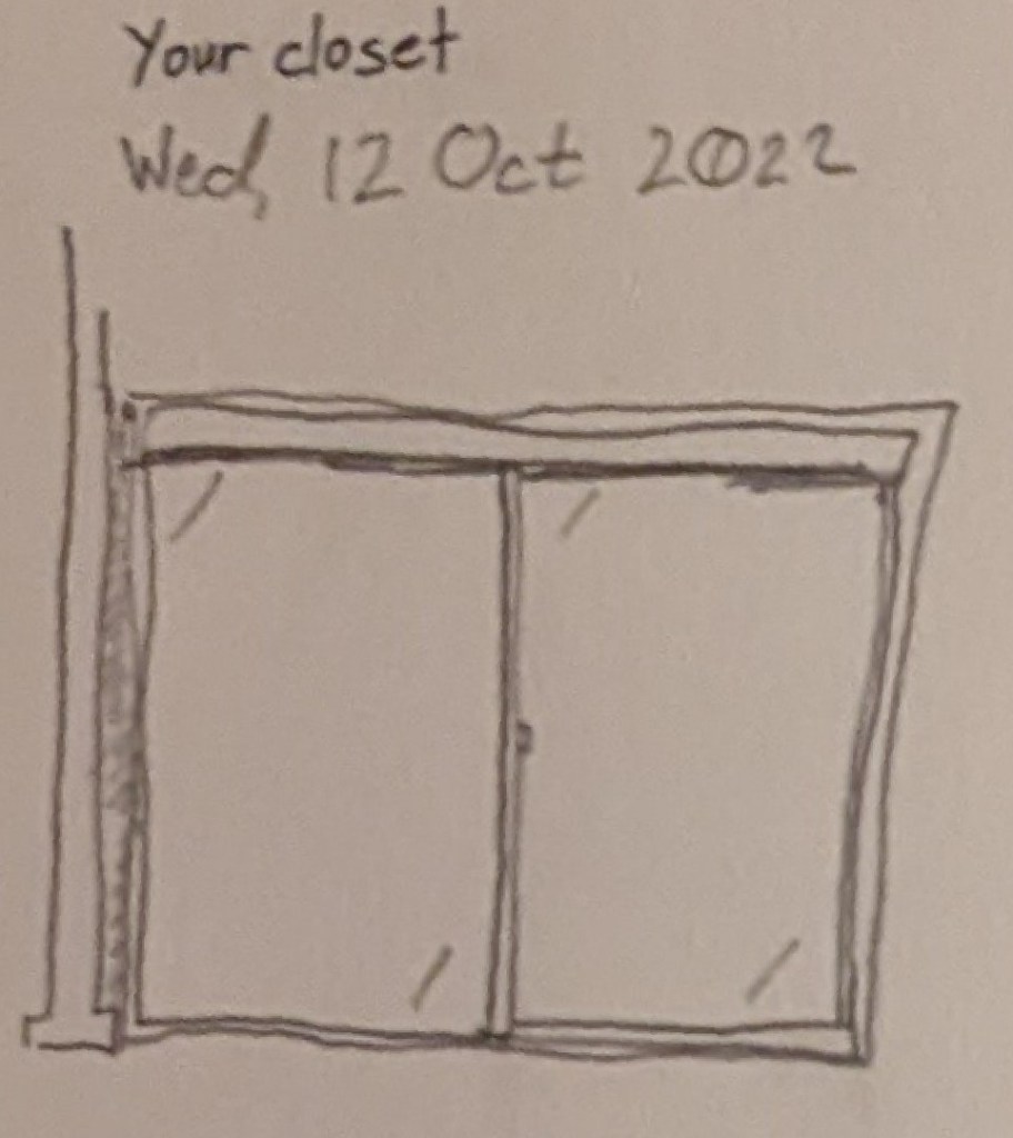My closet. I literally turned and looked at my closet to draw this. I don’t understand the big deal. Maybe I am just too CDO (door is always closed and everything inside is organized) for this to mean much to me.