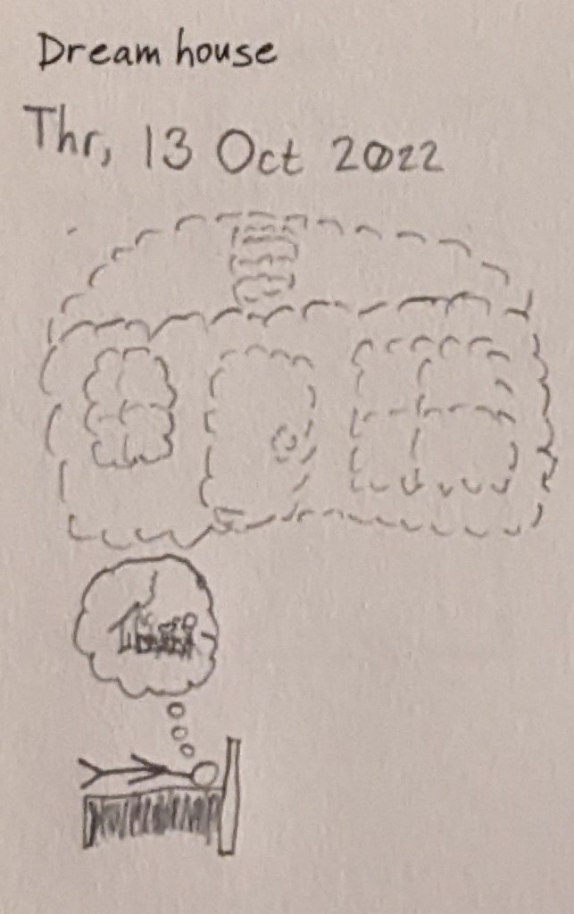 Two drawings. A house made of dreams (see the squiggly lines?… that’s how I draw dreams.) A person dreaming of a house… their dream house.